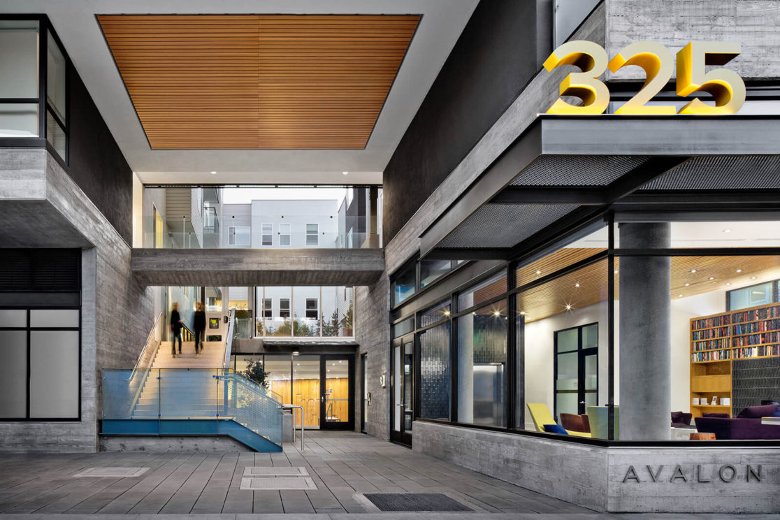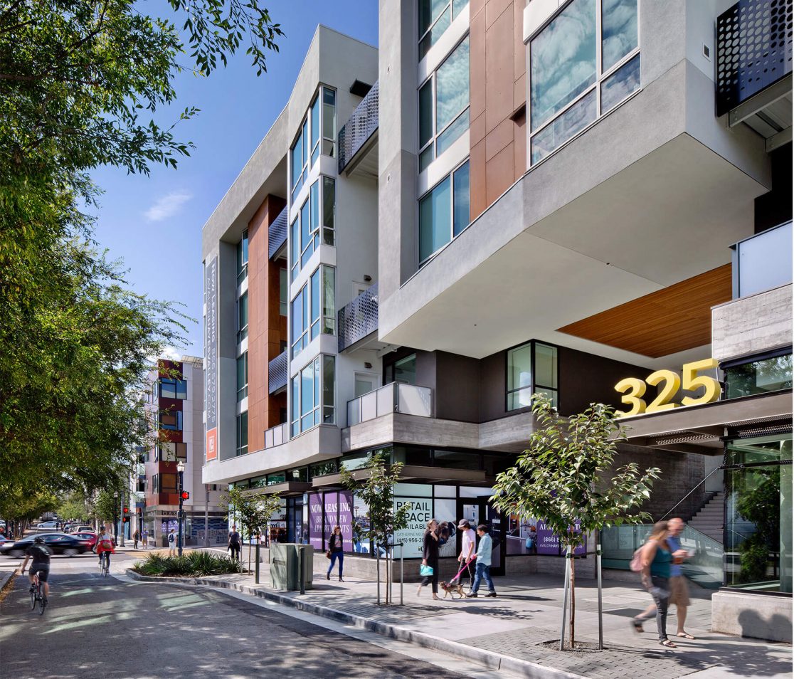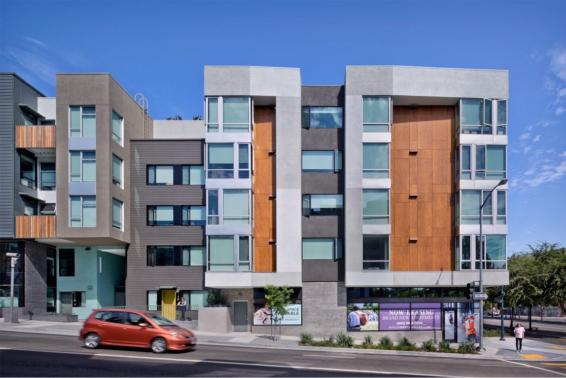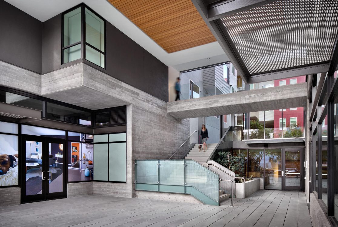 To develop Octavia Boulevard’s Parcel P, Build Inc. teamed with Avalon Bay Communities to adapt the master plan and create 182 apartments. Two large buildings bookend row-house parcels that step up the hill and enclose three midblock courts. We designed the mixed-use Octavia Building: 42 apartments above retail, with a tall portal entrance to the entire complex. The building’s units are organized into five discrete volumes, each topped with its own outdoor room.