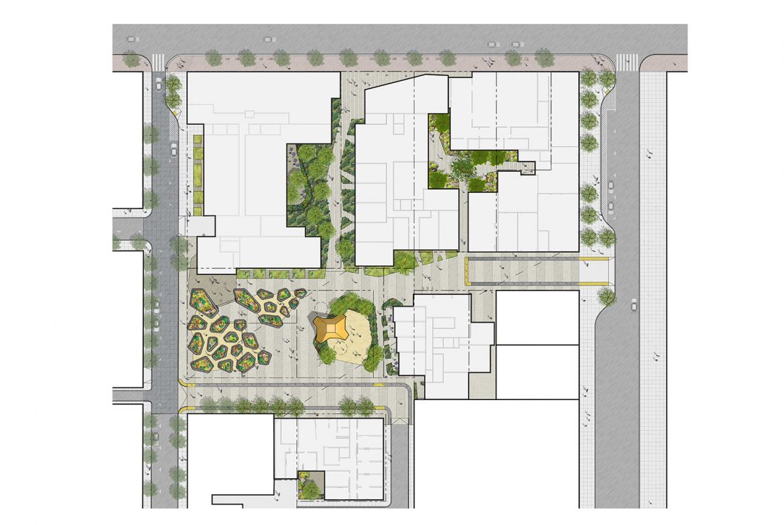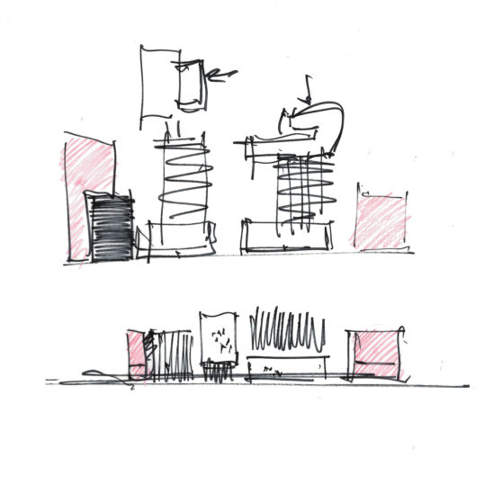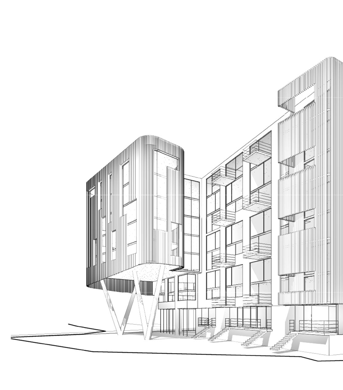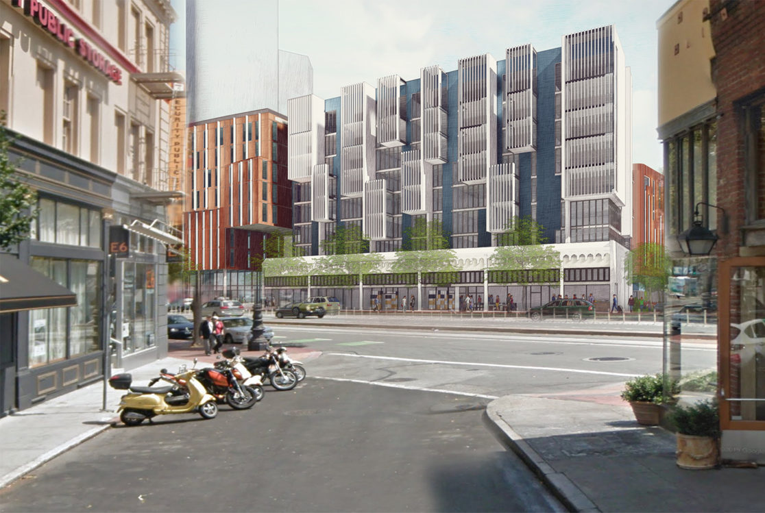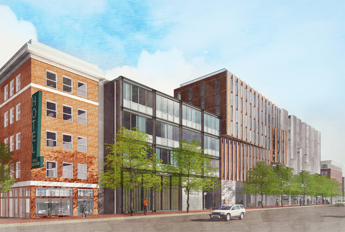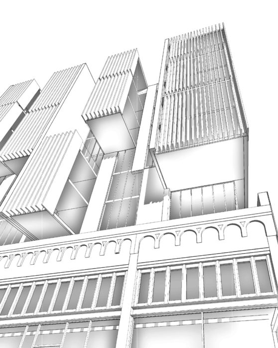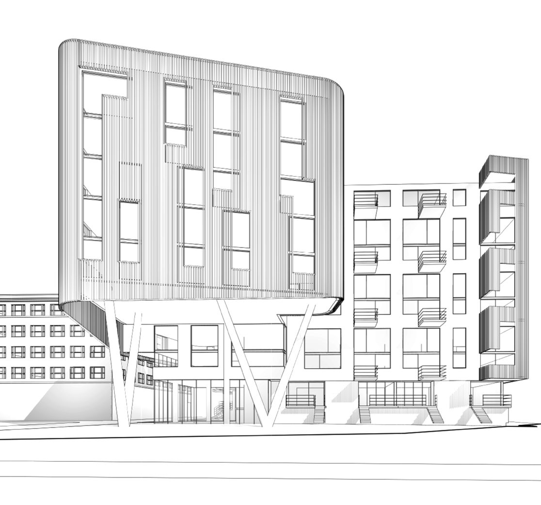 This 197-unit apartment building with ground-floor retail space is part of a larger mixed-use redevelopment scheme. Kennerly Architecture & Planning collaborated with David Baker Architects to revise the master plan, which will add 584 market-rate and affordable residences, replace a union hall, redevelop a historic retail building, and add a public park. Kennerly’s building integrates and defers to the historic retail structure, while holding the street edge with deep cantilevered bays above.
