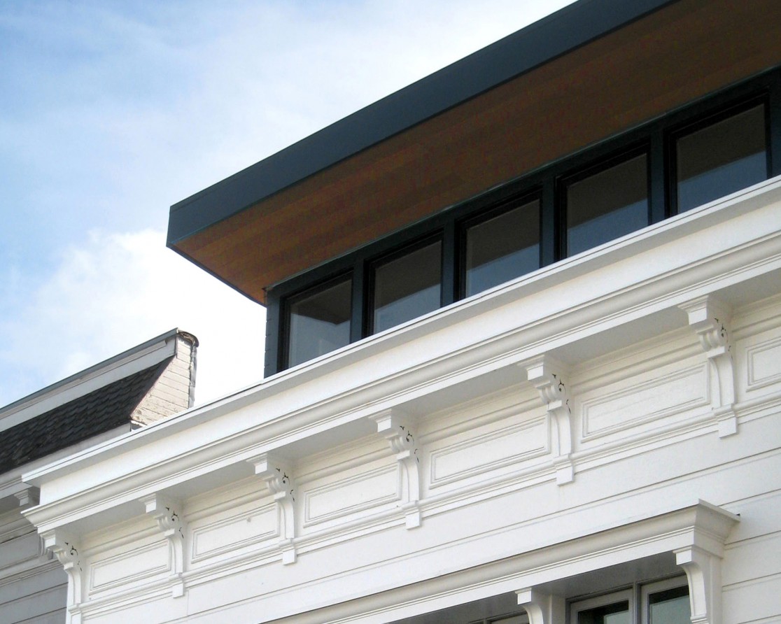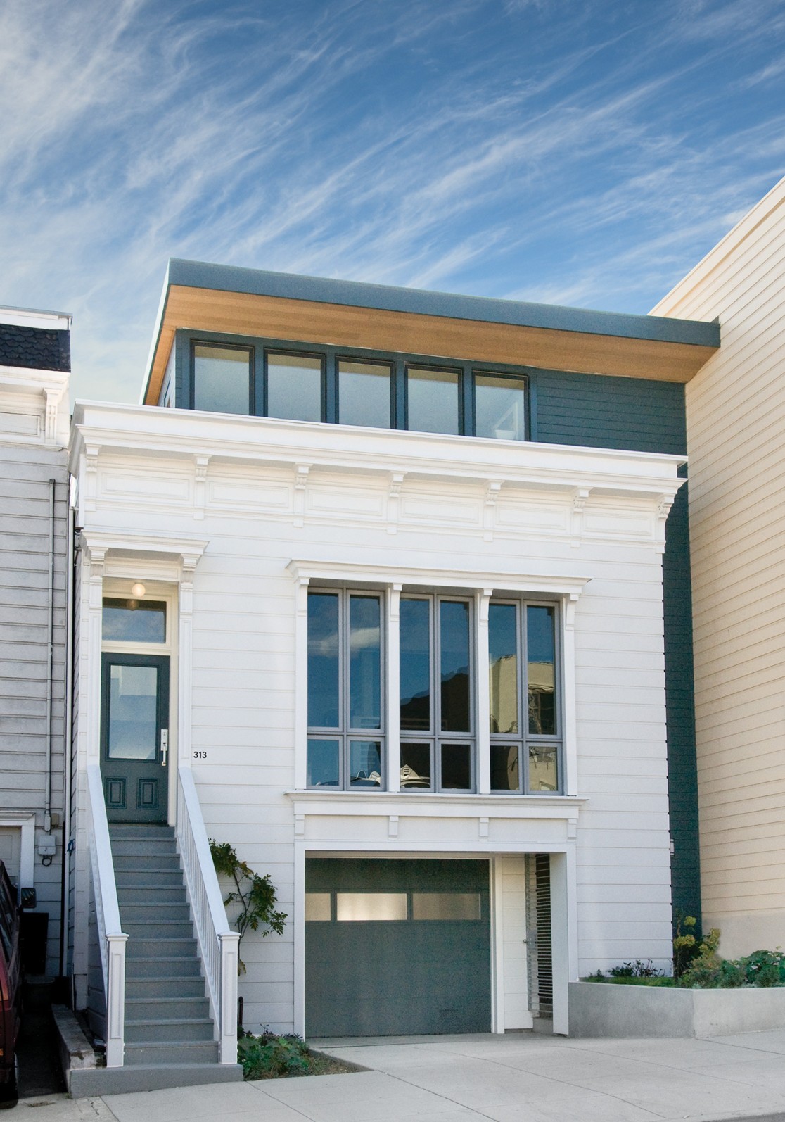 To renovate and gracefully expand a narrow, dilapidated house dating back to the 1880s, we drew on the design language and proportions of the original. Behind the restored Victorian façade, the split-level interior includes three open-plan floors with four bedrooms and three private patios. A roof deck offers views of the city. We also remodeled the existing one-bedroom guest house in the back private garden, inserting a large skylight and a mezzanine level.