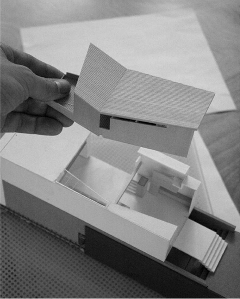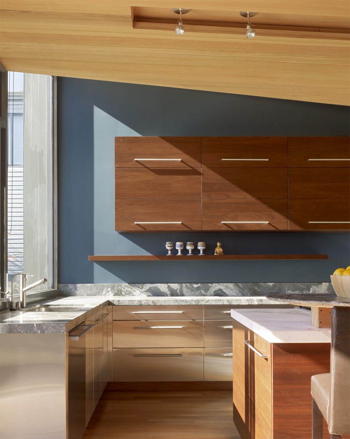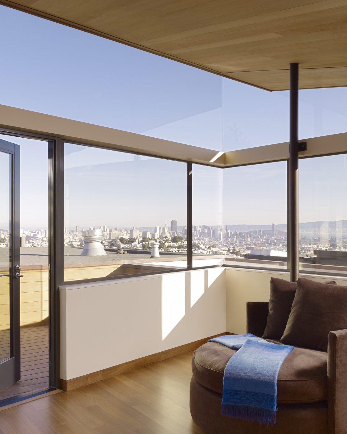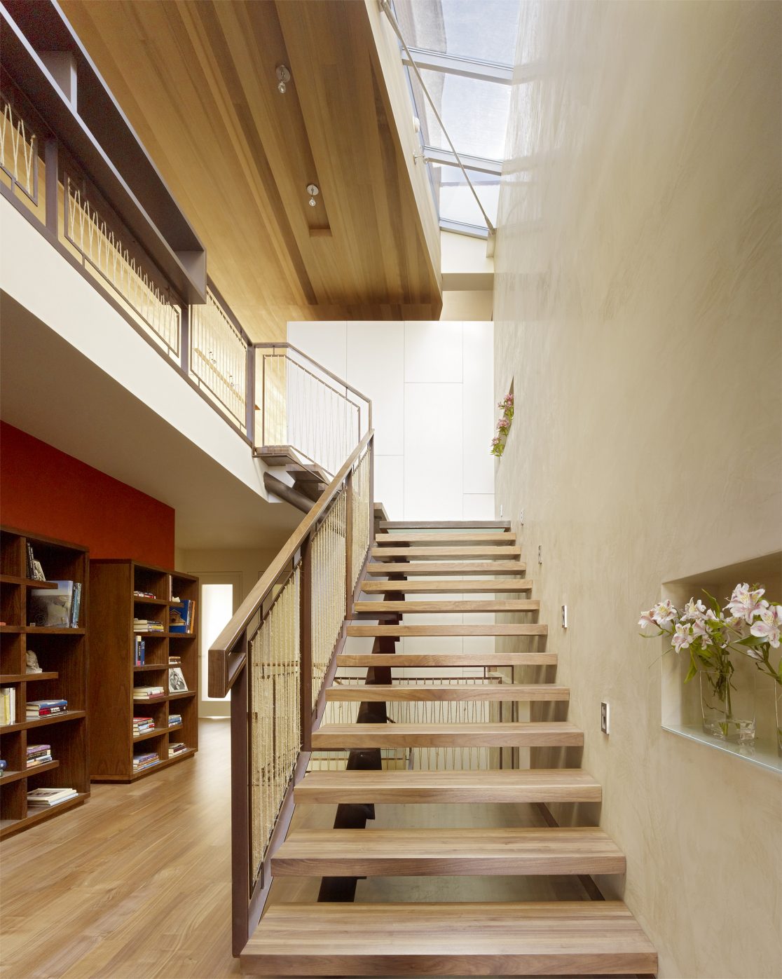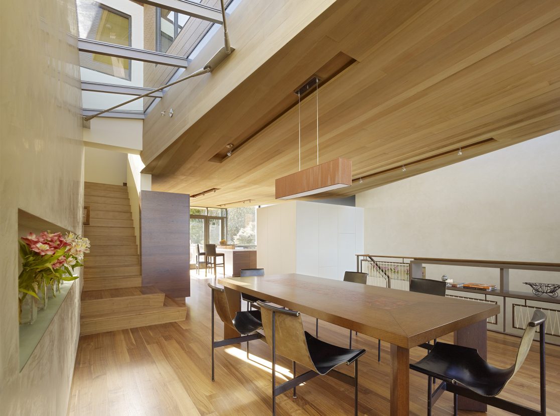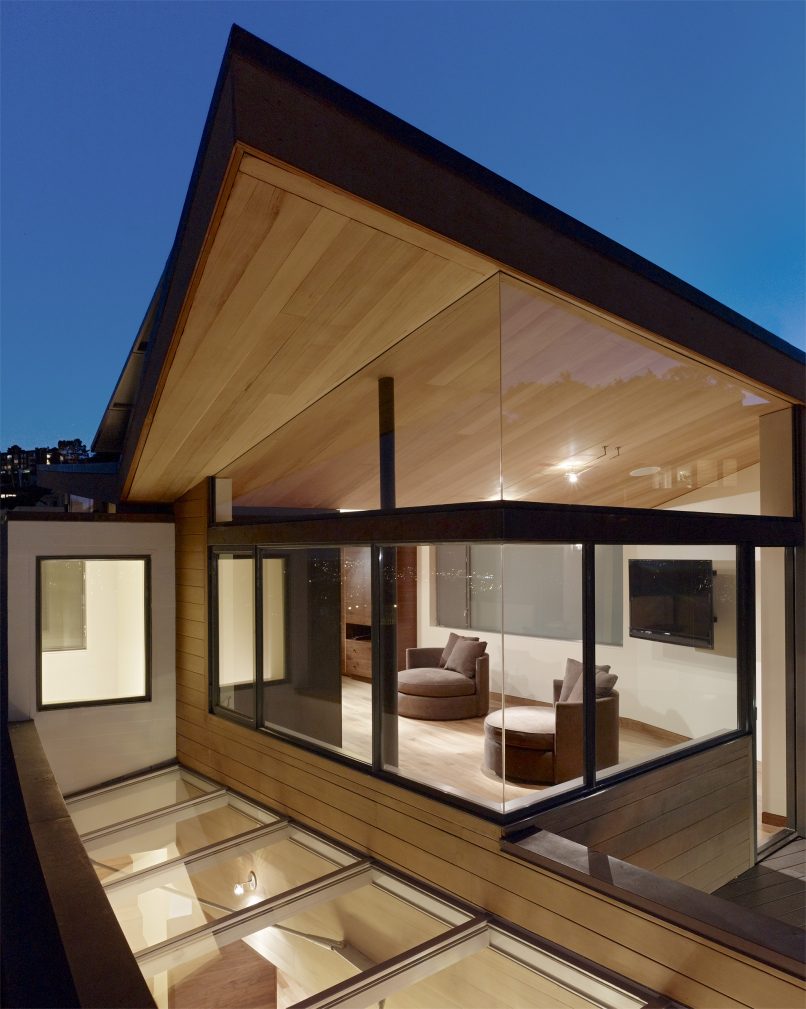 Like a ship in a bottle, the facetted cedar master suite is suspended overhead between skylights that bring sun-light deep into the center of the home.