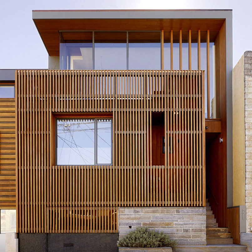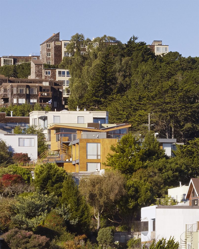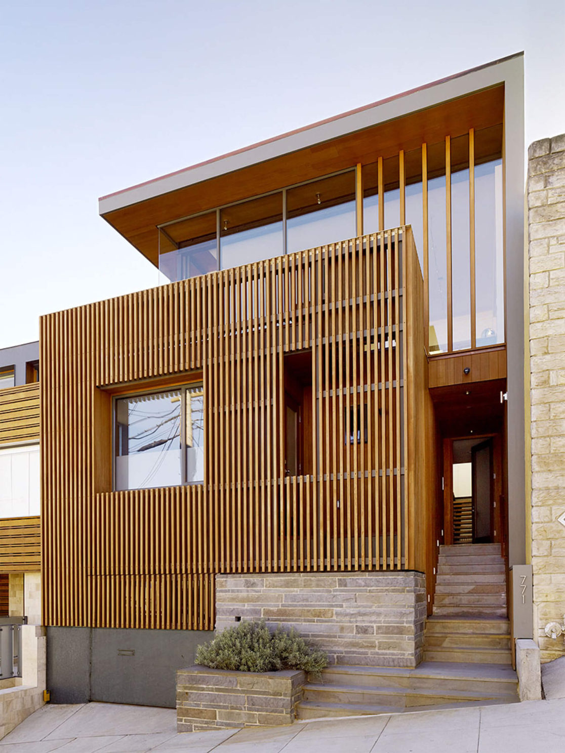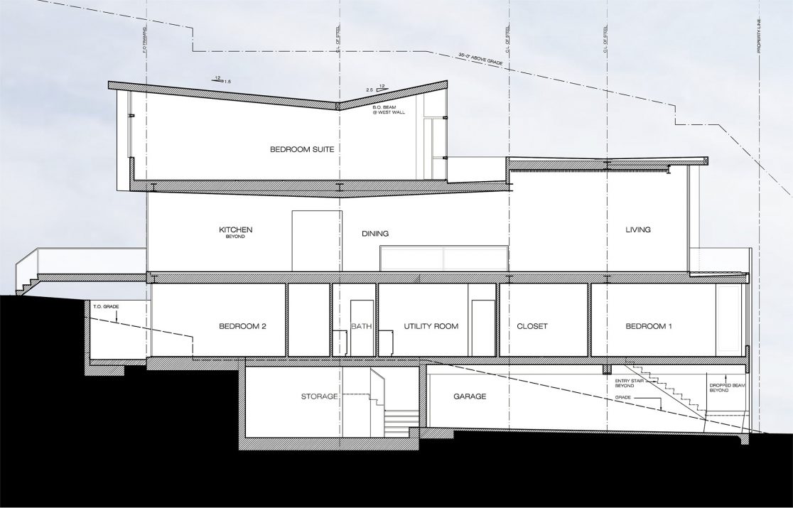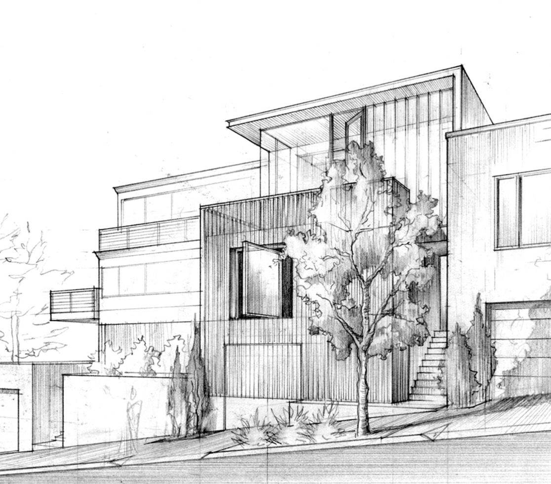 The existing house is stretched back into the slope of the hill establishing a podium of bedrooms and service areas. Its façade is wrapped in a veil of cedar pickets. Above, the open living area with glass at both ends accesses the garden and panoramic views.