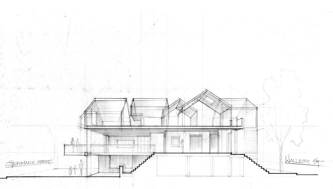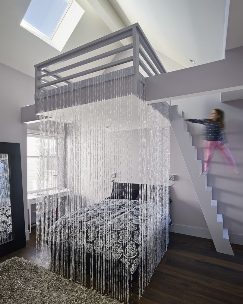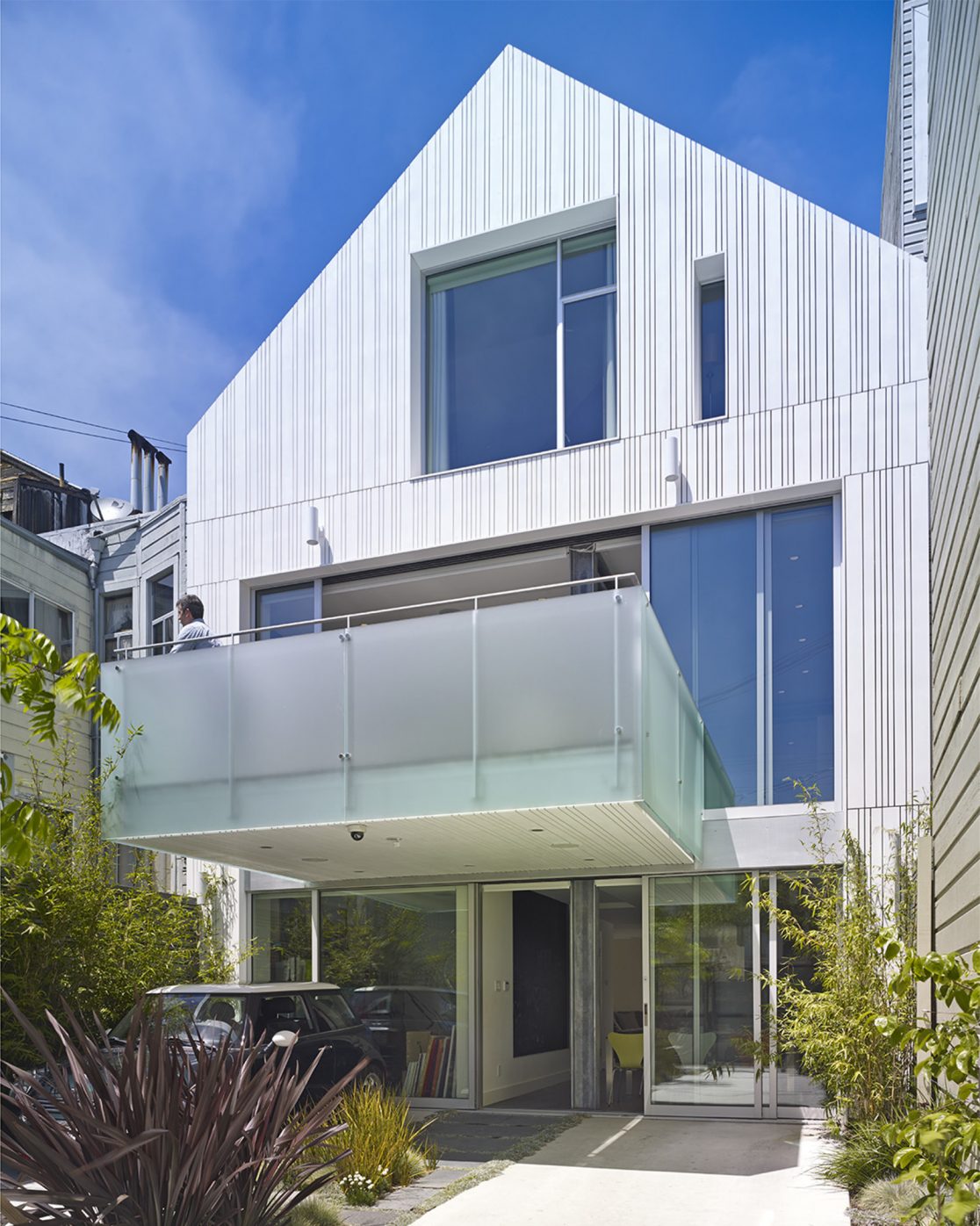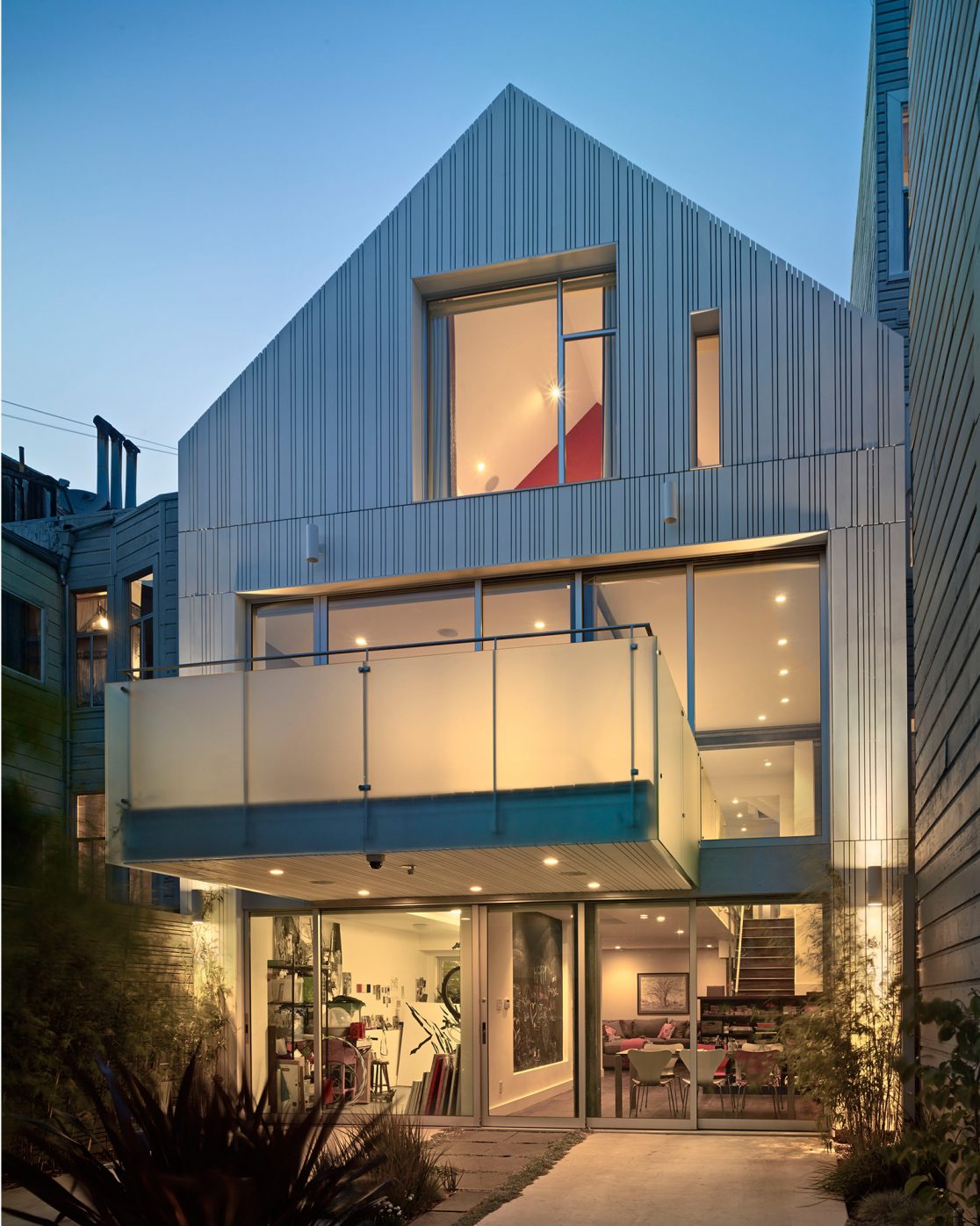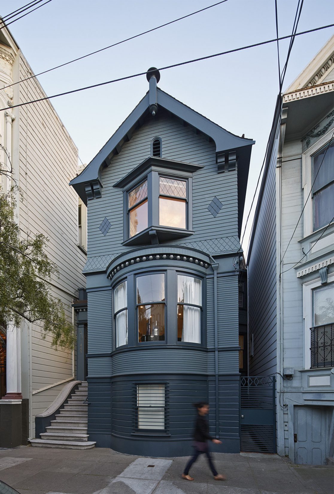 We remodeled a 4,300-square-foot Victorian in Duboce Park for a family of five, restoring the original façade while transforming the dilapidated alley facade to present a modern face to the garden and private driveway. Operable glass walls bring in natural light. A glass and steel deck cantilevers out 10 feet, extending the second-floor kitchen/family room/dining room level over the garden. The third floor contains four bedrooms, including two carved out of the existing attic.