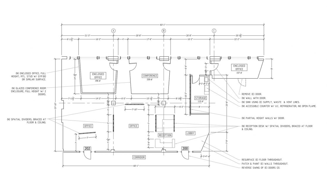 To remodel space at 49 Geary Street for an art gallery, we stripped the interiors down to the raw concrete structure and added walls strategically, maintaining a sense of openness while maximizing opportunities for display and improving acoustic control. The gallery includes a conference room that doubles as an office, an art storage area, a reception area, and two exhibition areas.